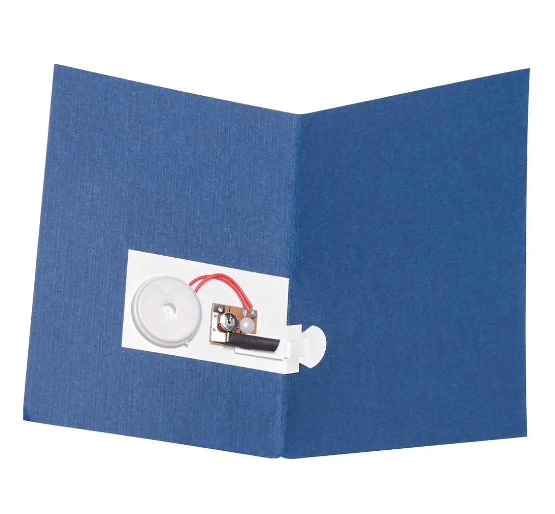Für die korrekte Anbringung des Musikchips in einer Karte kleben Sie den Musikchip-Aufkleber so in den Falz der Karte, dass die weiße Lasche durch das Öffnen der Karte den Musik-Kontakt mit der silbernen Schienen verliert (durch die Öffnung in der Lasche). In diesem Moment wird die Musik abgespielt.
