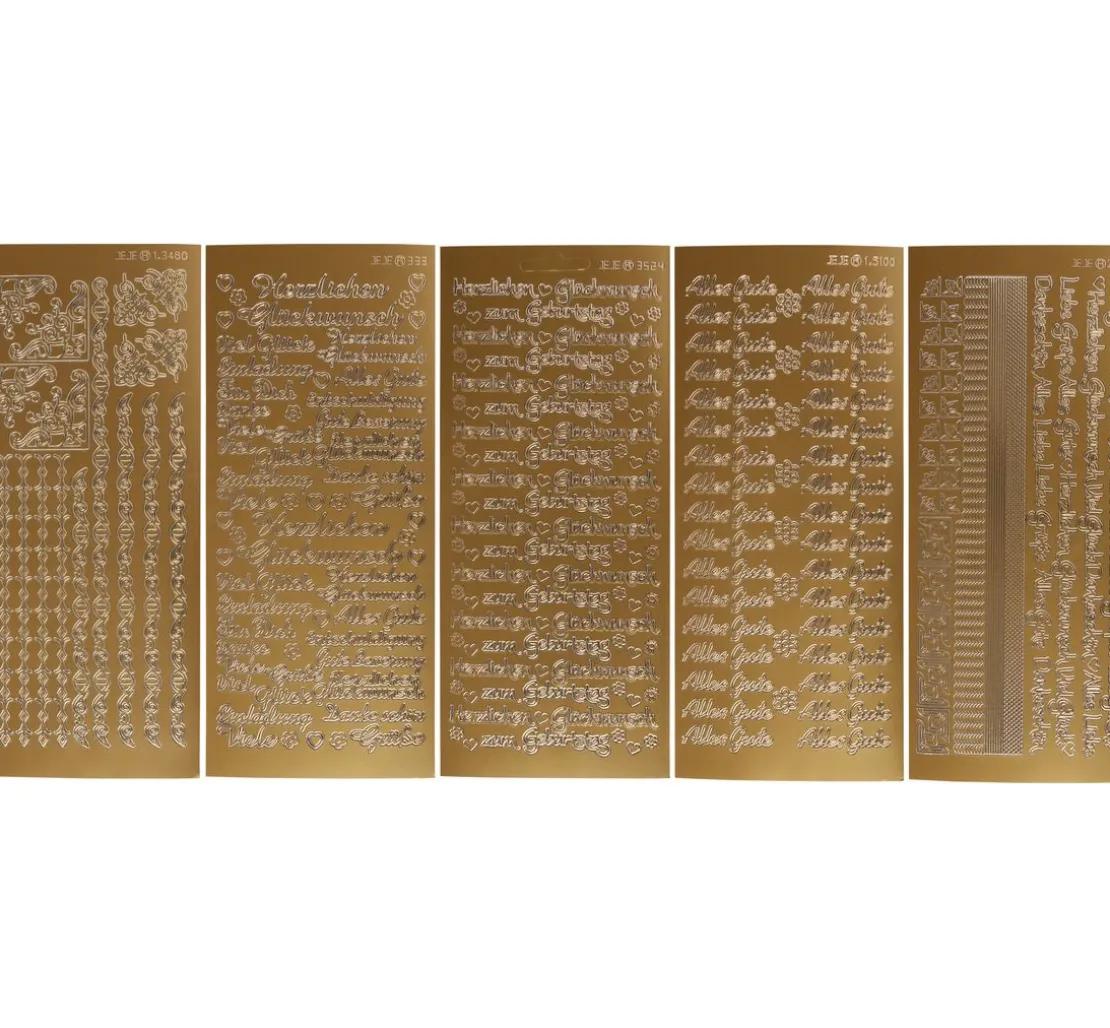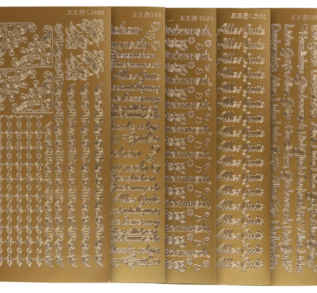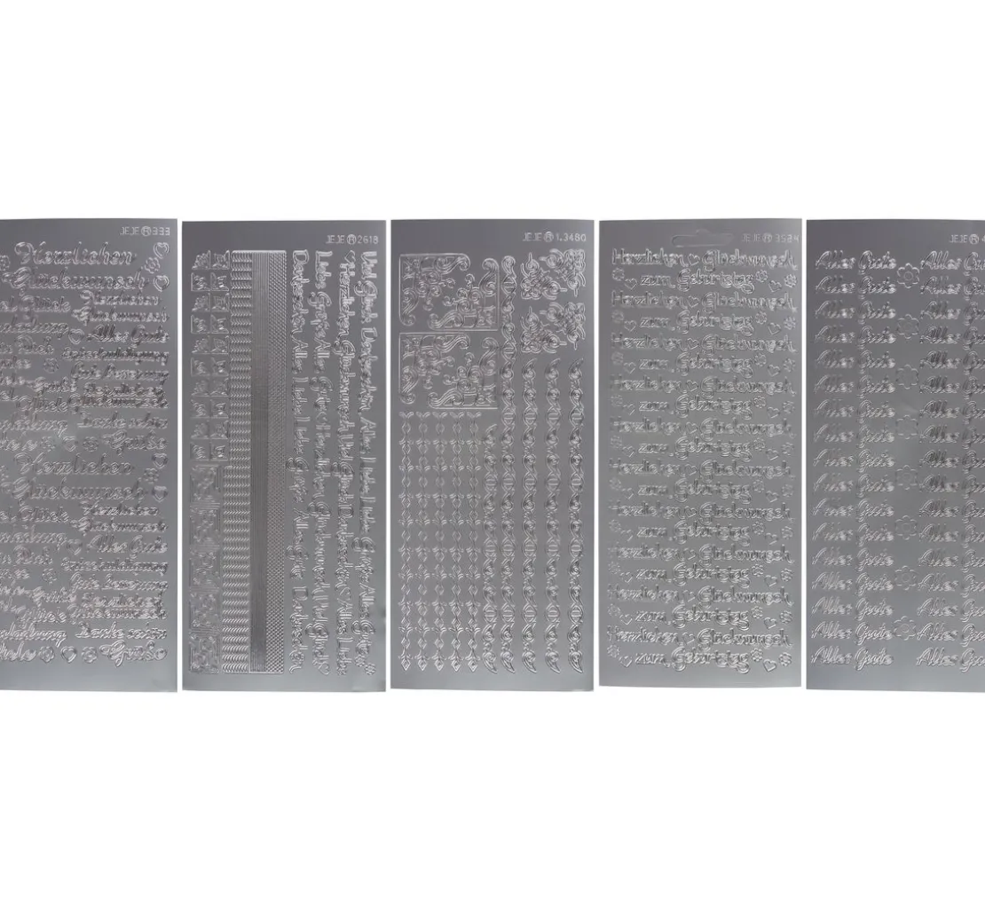 Edles VBS Reliefsticker-Set „Glückwünsche“ für die kreative Gestaltung zu verschiedenen Anlässen. Es sind 5 Stickerbogen mit verschiedenen Ornamenten und Bordüren, Herzen und Blumen sowie verschiedenen Schriftzügen zum Geburtstag, zur Genesung, als Einladung oder ganz allgemein als Wunsch enthalten.