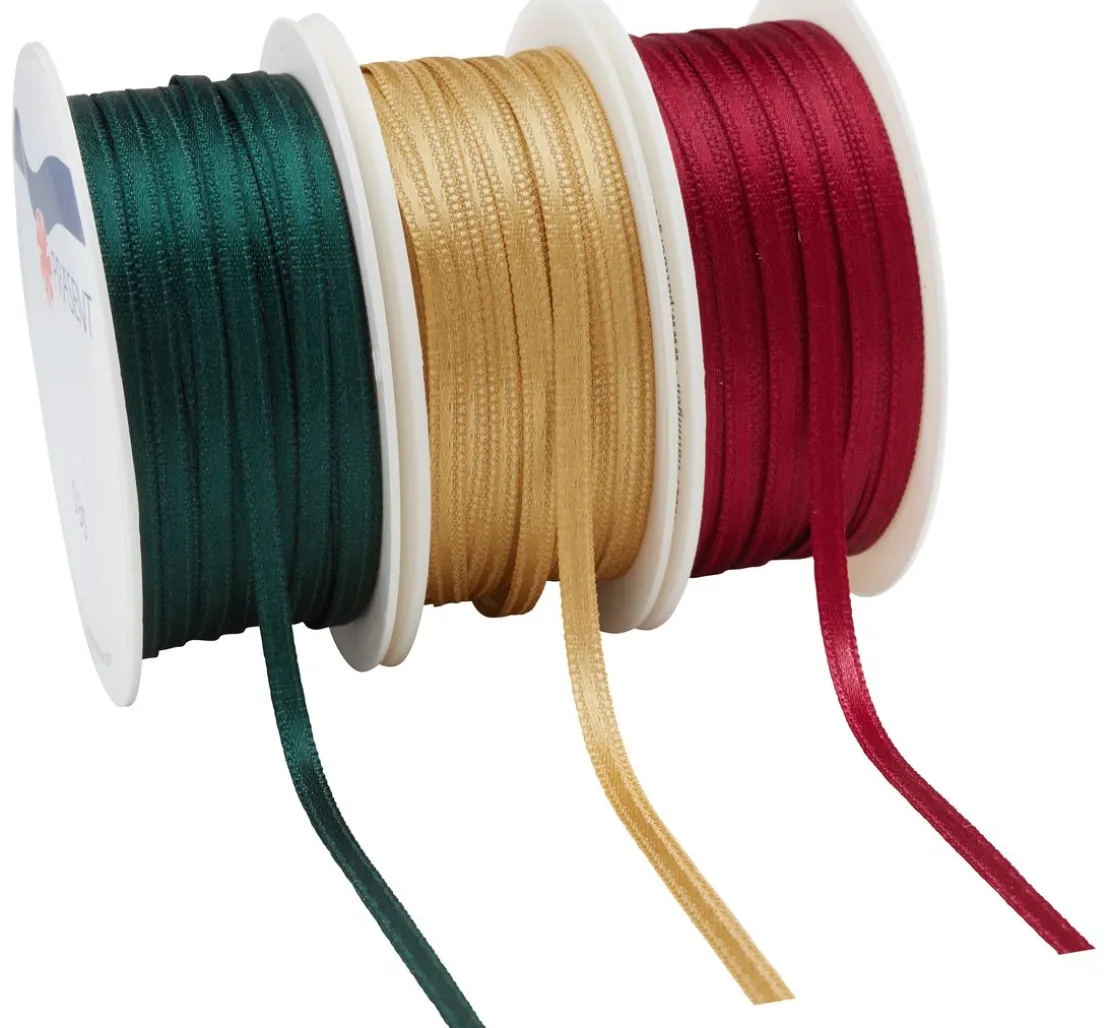 VBS Satinband „Christmas Time“ mit einer Breite von ca. 3 mm und einer Länge von ca. 10 m aus 100 % Polyester. Die klassischen weihnachtlichen Farben Tannengrün, Gold und Bordeaux lassen sich für vielseitige Kreativarbeiten verwenden.