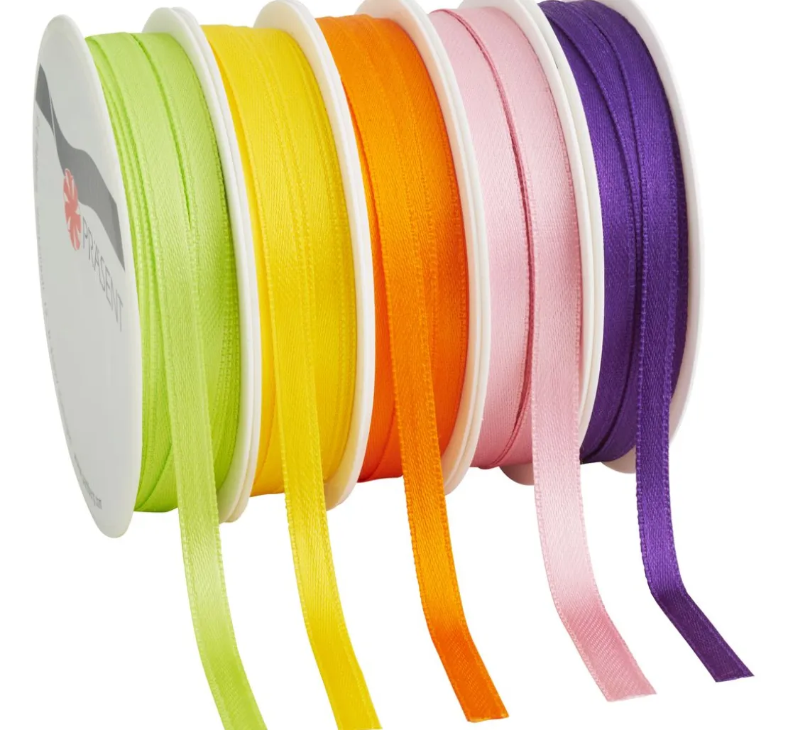 Das VBS Satinband „Happy days“ ist ein 5er-Set in den frühlingsfrischen Farben Gelb, Hellgrün, Orange, Altrosa und Violett. Die Bänder haben eine Breite von ca. 6 mm und eine Länge von jeweils ca. 3 m.