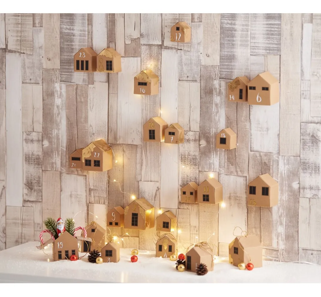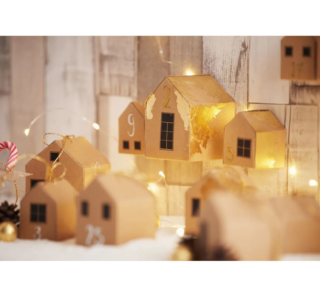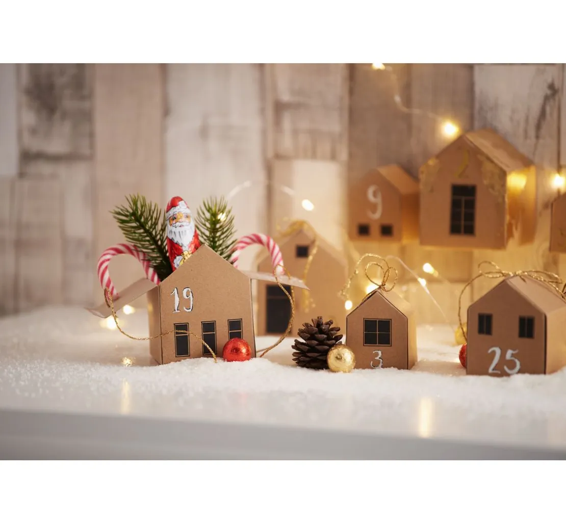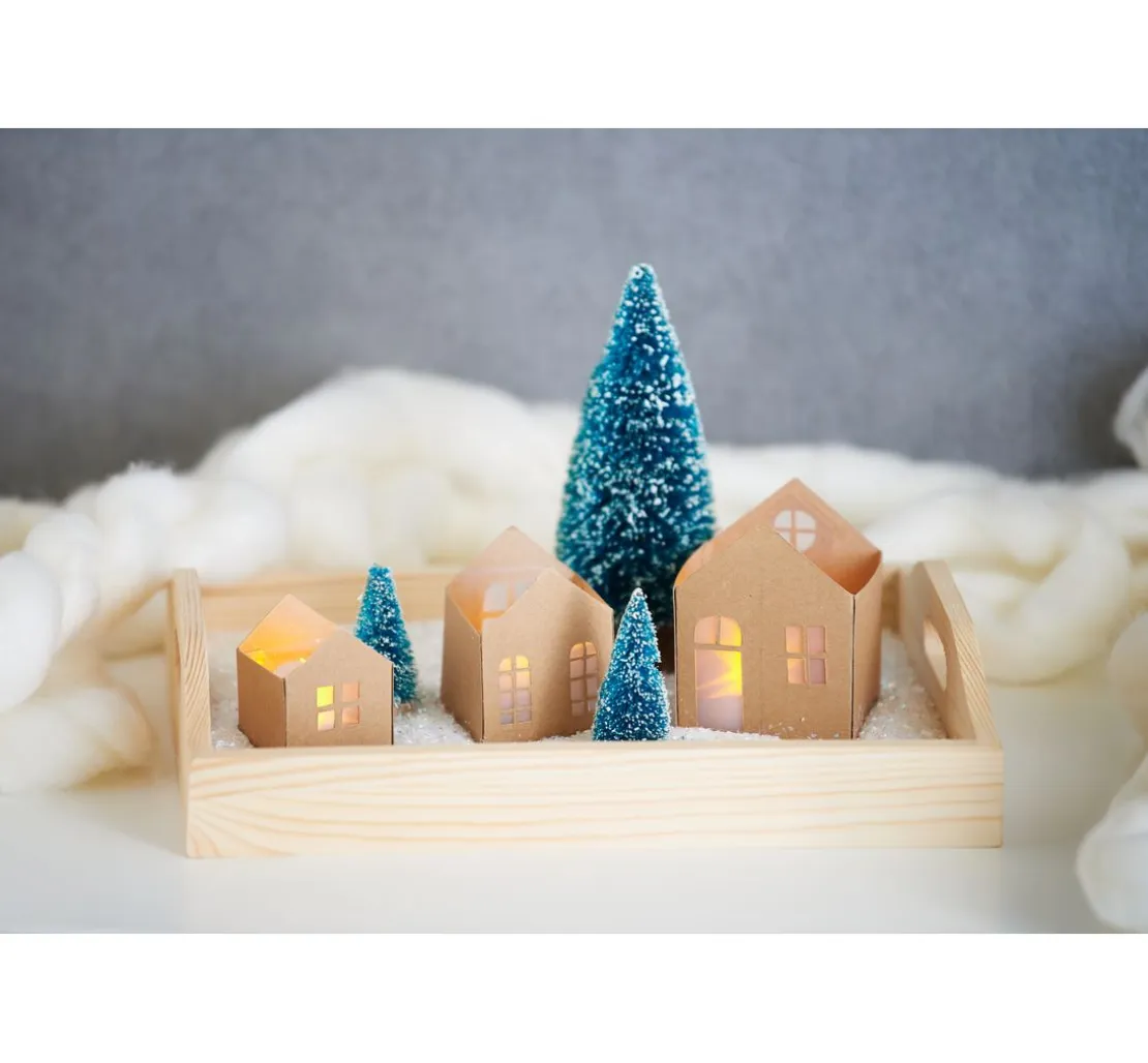 Durch eine kleine Öffnung im Boden können die Häuser mit einer Micro-LED Lichterkette ausgestattet werden. Fenster hinein schneiden und kleine Sterne im Dach ausstanzen. So kommt zusätzlich Glanz in die Häuser.