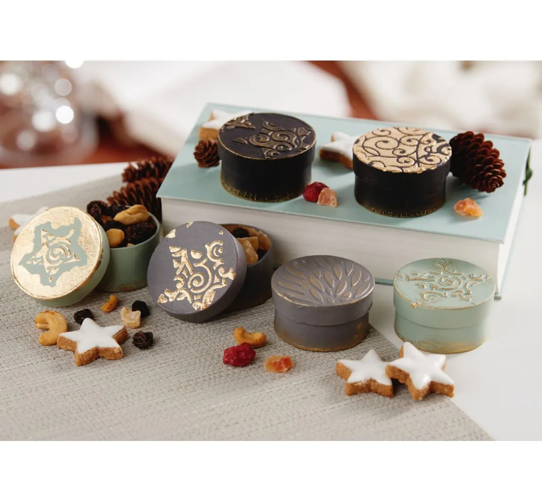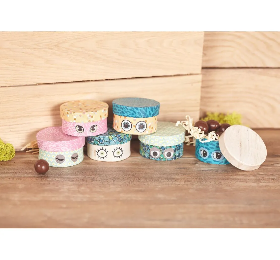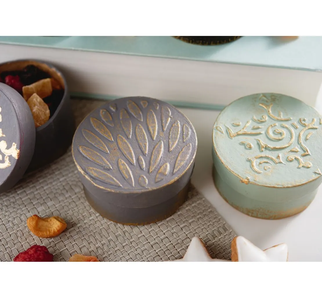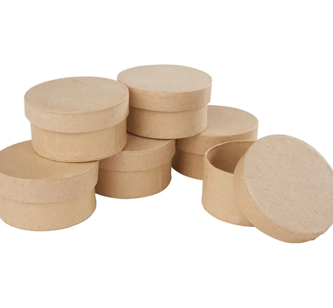 Die Rundschachteln aus Pappmaché haben einen Durchmesser von ca. 6 cm und sind ca. 3 cm hoch. Sie eignen sich ideal als Schmuckschachteln, Geschenkschachteln oder für die Umsetzung vieler kreativen Ideen, wie z. B. Adventskalendern.