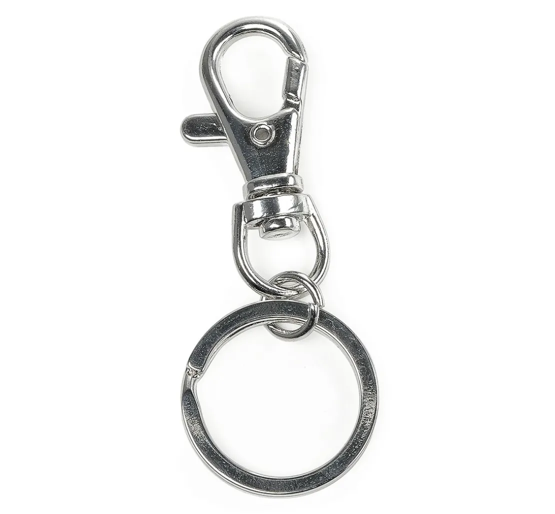 Der Schlüsselanhänger mit Karabinerhaken besteht aus Metall. Der Karabinerhaken ist ca. 38 mm lang und ca. 16 mm breit. Der Durchmesser des Schlüsselringes beträgt ca. 25 mm.