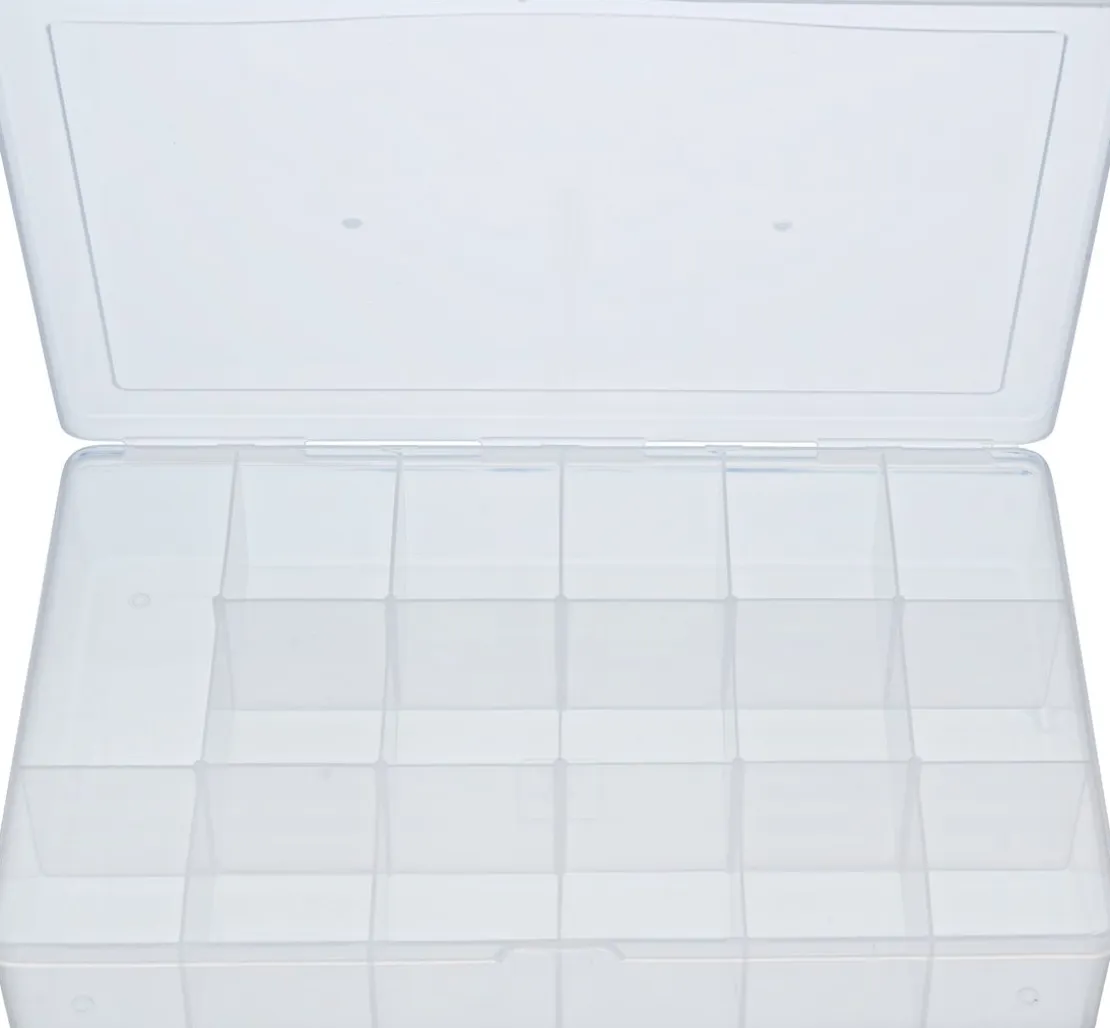 Die Sortimentsbox besteht aus stabilem Kunststoff und verfügt über 16 gleichgroße Fächer mit praktischer Einteilung und einem größeren Fach.