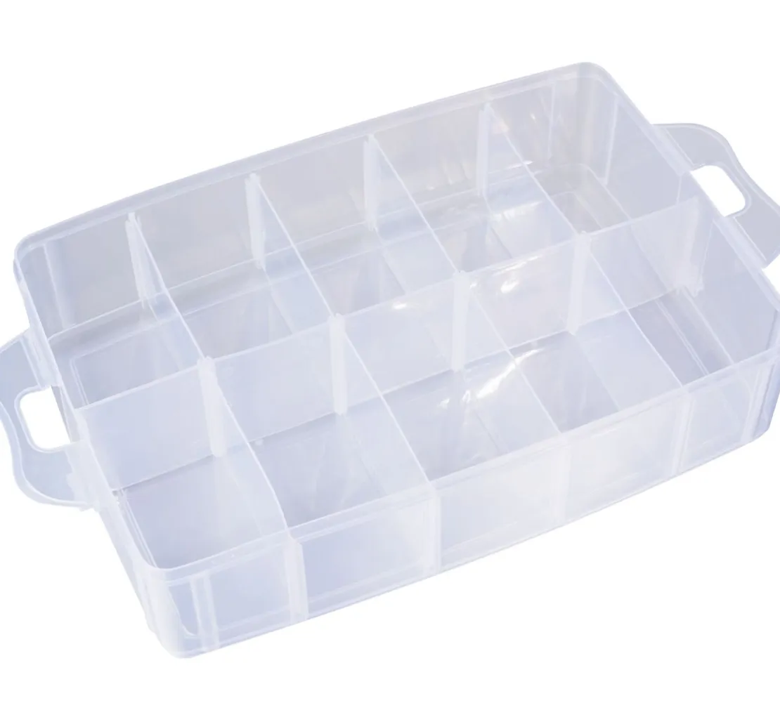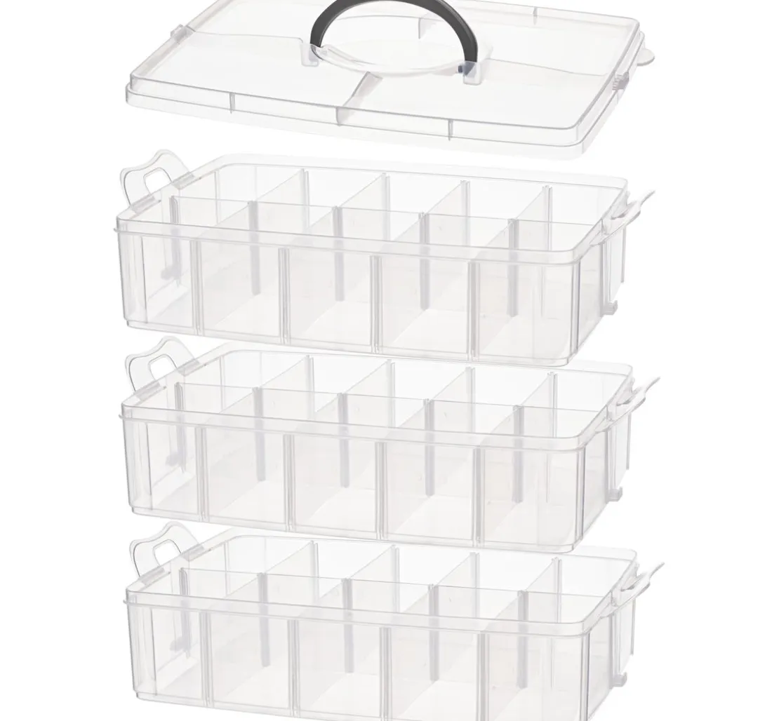 Viel Platz für kleine und große Teile! In dieser zweckmäßigen Stapelbox finden Schrauben, Perlen, Streuteile, Farben, Pinsel, Nähutensilien und vieles mehr einen Platz. So ist alles gut und übersichtlich sortiert. Die handliche Box kann schnell im Regal verstaut werden und ist jederzeit griffbereit.