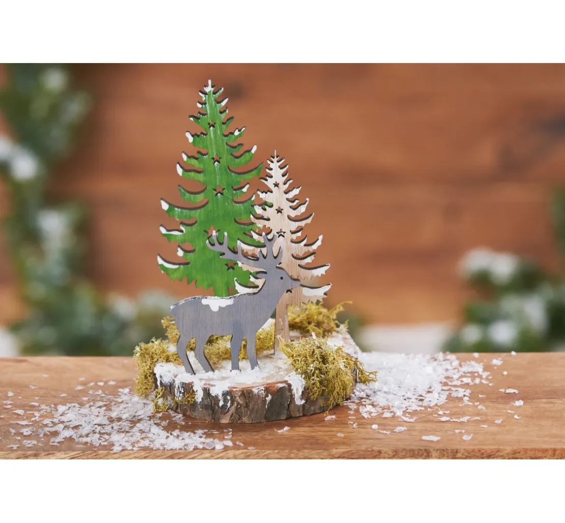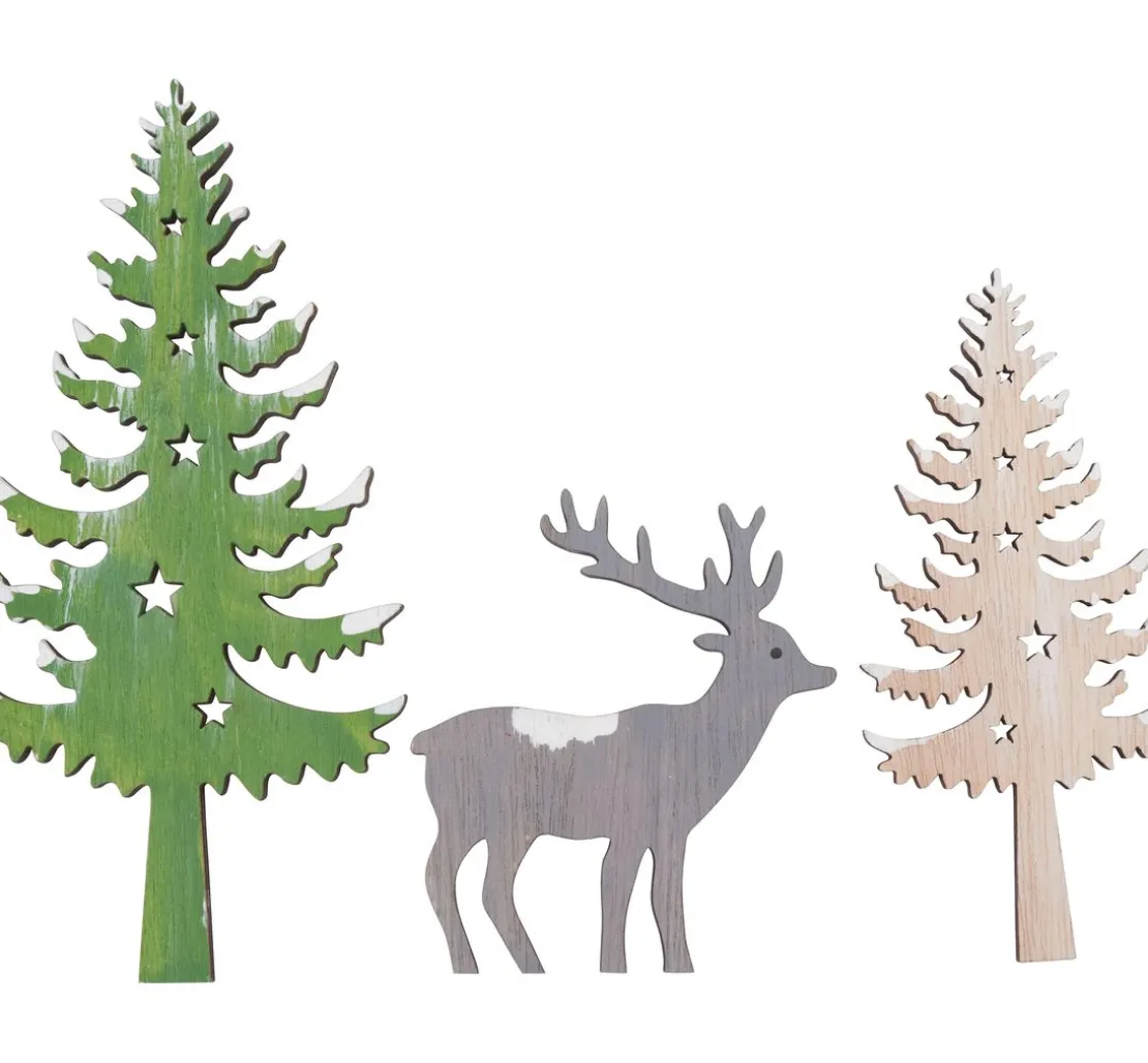 VBS Tannen und Hirsch „Snuggles“ als 3er-Set bestehend aus einem Hirsch mit einer Größe von ca. 8 x 9 cm, einer großen Tanne 8 x 17 cm und einer kleineren Tanne mit 6 x 13 cm. Die große Tanne und der Hirsch sind einseitig koloriert. Alle Teile haben weiße Akzente, die den Schnee andeuten und auf den Tannenbäumen sind lasergeschnittene Sterne in unterschiedlichen Größen. Das Material ist hochwertiges Sperrholz mit einer Stärke von ca. 4 mm.