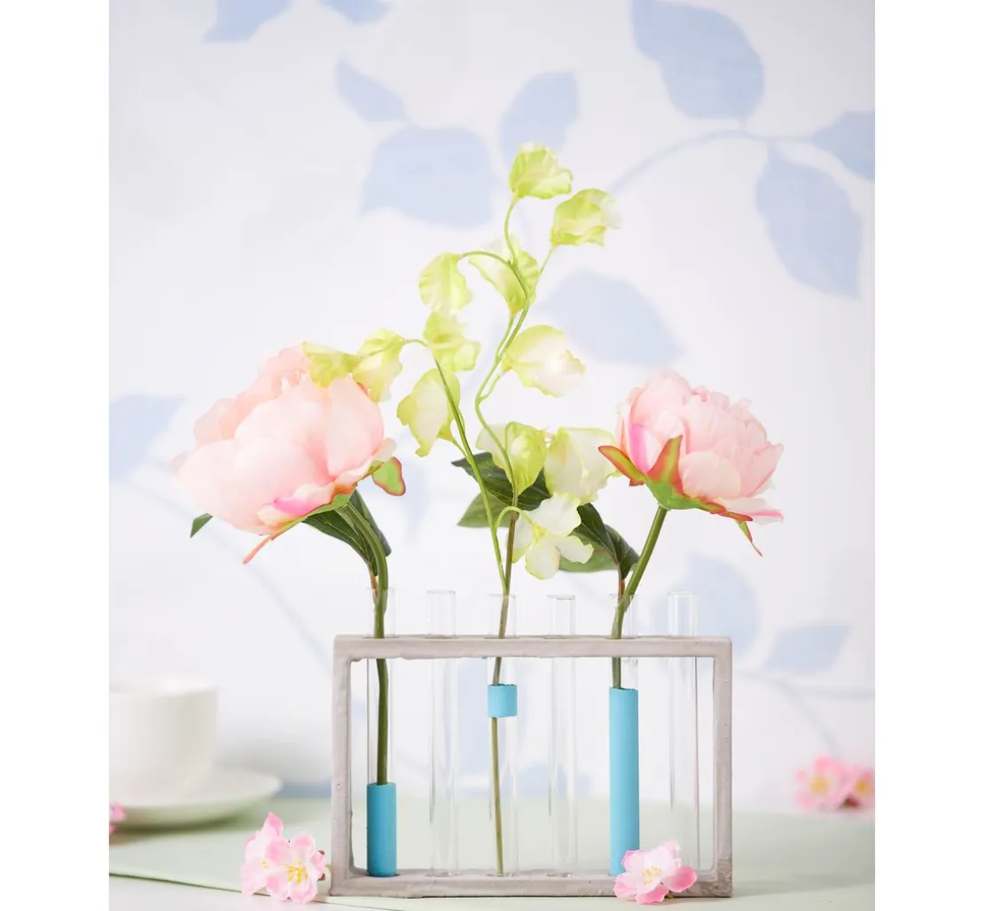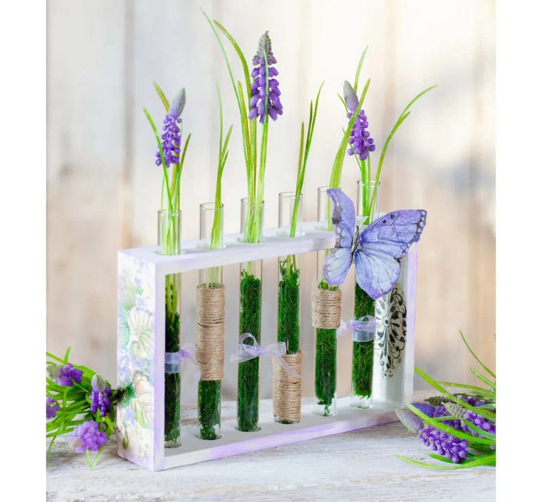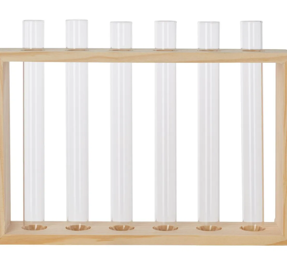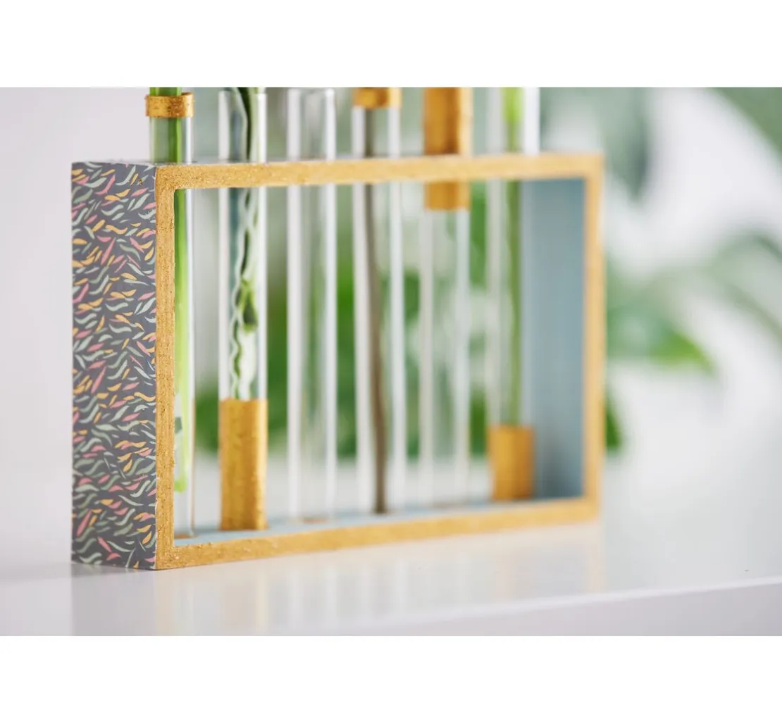 Eine Vase mit einem Rahmen aus Rohholz und Reagenzgläsern aus Glas. Sie können den Rahmen besonders einfach mit Techniken wie der Décopatch oder Servietten-Technik gestalten oder mit Farben arbeiten. Die Reagenzgläser sind ein ungewöhnliches Vasen-Element und die Anordnung lässt ganz neue Blumenarrangements zu.