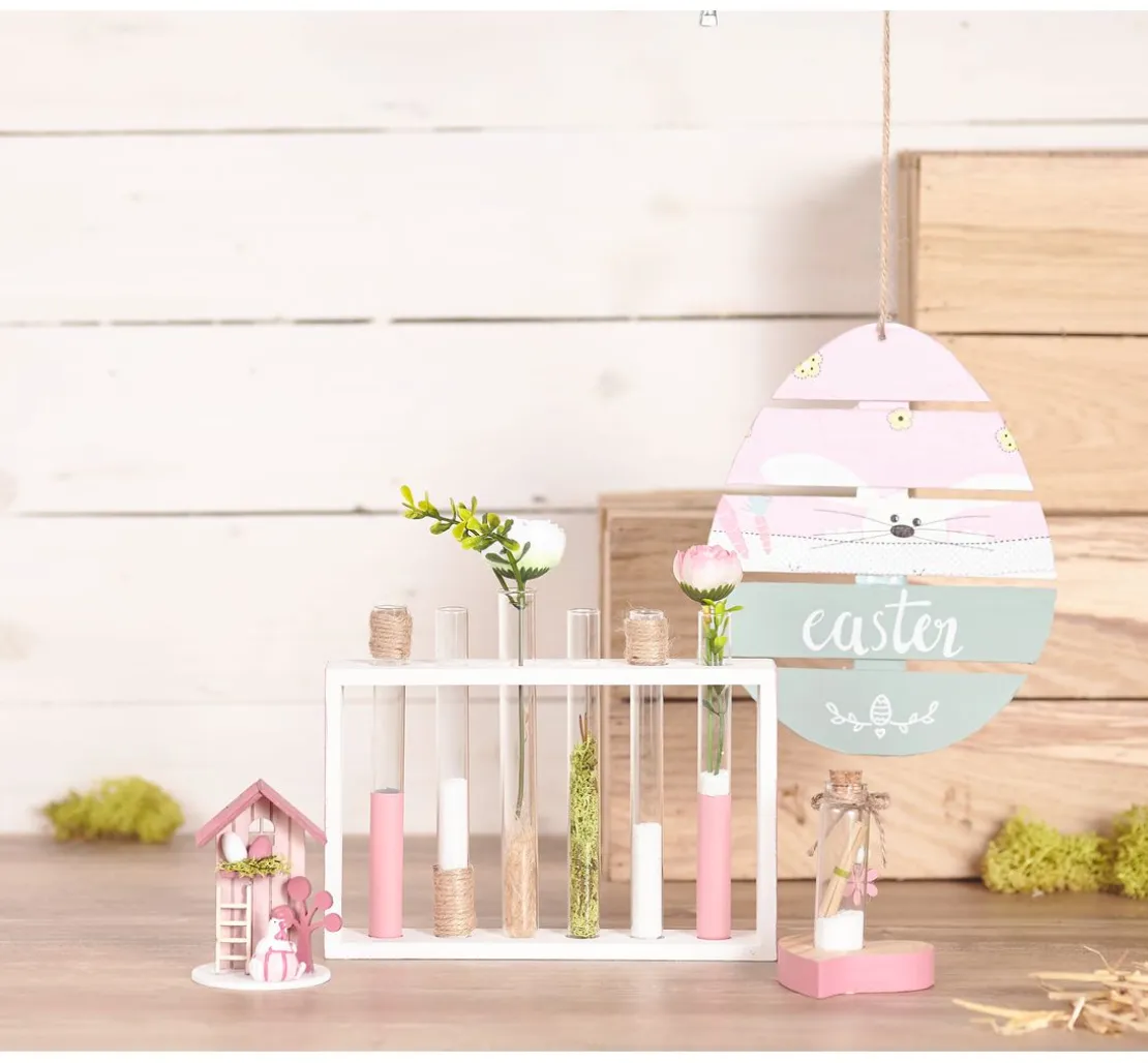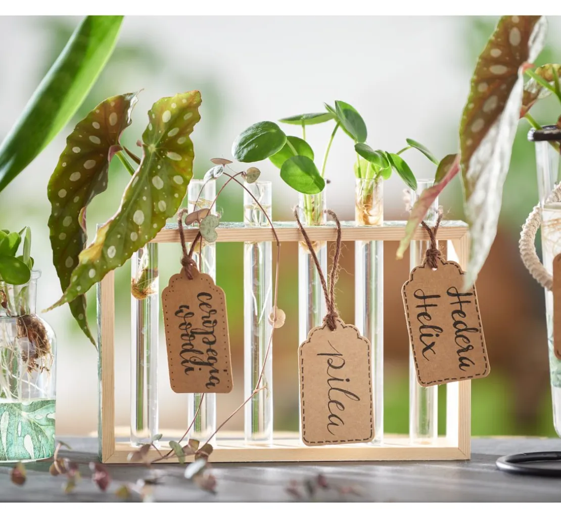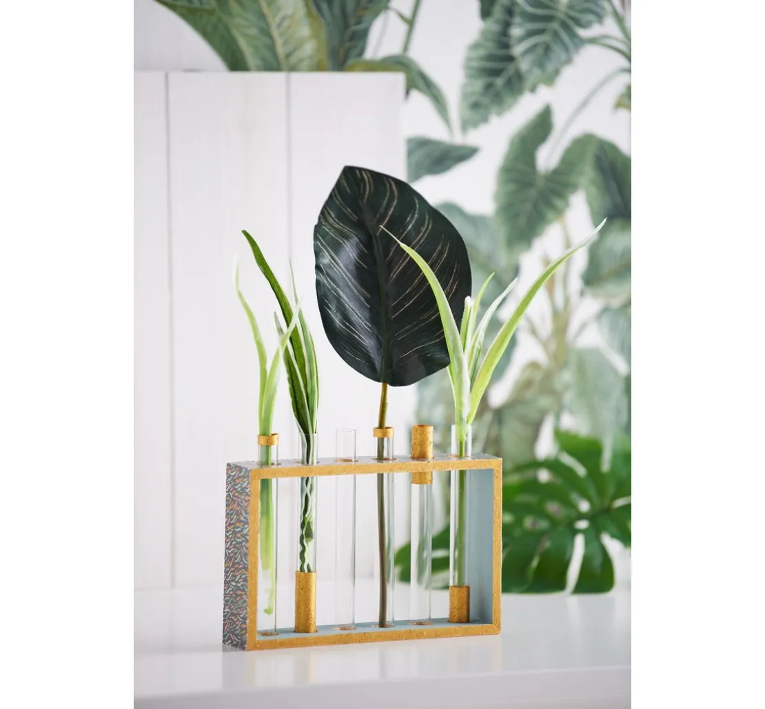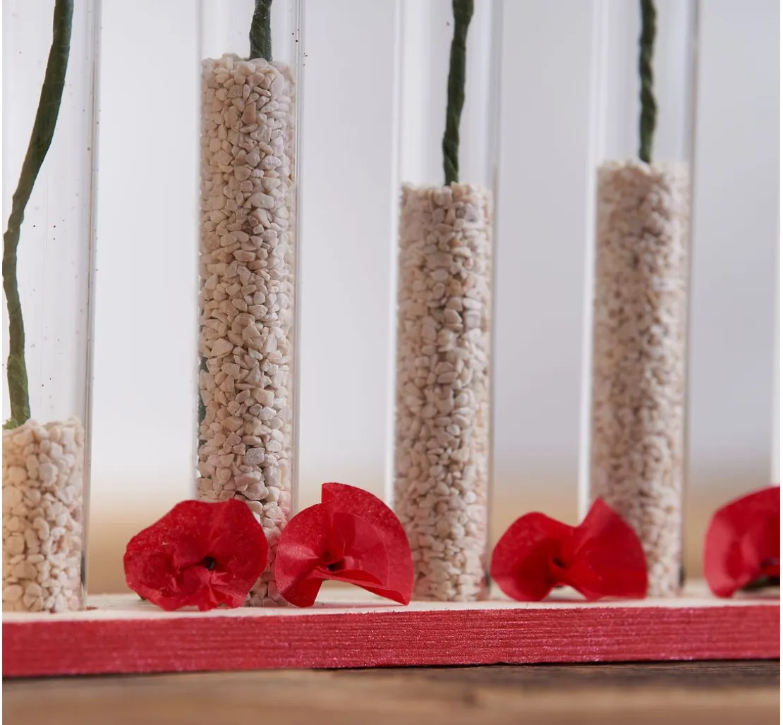 Eine Vase mit einem Rahmen aus Rohholz und Reagenzgläsern aus Glas. Sie können den Rahmen besonders einfach mit Techniken wie der Décopatch oder Servietten-Technik gestalten oder mit Farben arbeiten. Die Reagenzgläser sind ein ungewöhnliches Vasen-Element und die Anordnung lässt ganz neue Blumenarrangements zu.