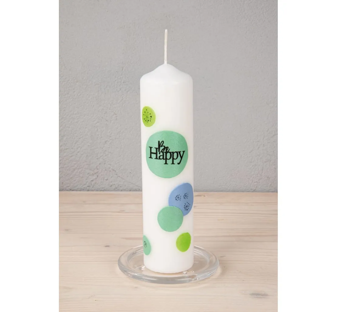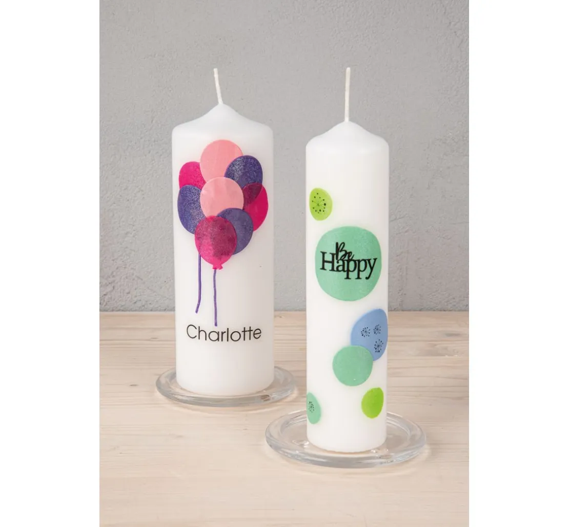 Mithilfe einer Schere, Ausstechformen, spitzem Küchenmesser, Stanzer oder einem Schneide- und Perforierstift können die Wachsplatten individuell zugeschnitten werden. Sie lassen sich nicht nur auf Kerzen aufbringen, sondern auch auf Glas, Kunststoff und sogar Pappe oder Holz (hier mit doppelseitigem Klebeband aufkleben). So werden aus schlichten Kerzendekorationen wahre Hingucker.