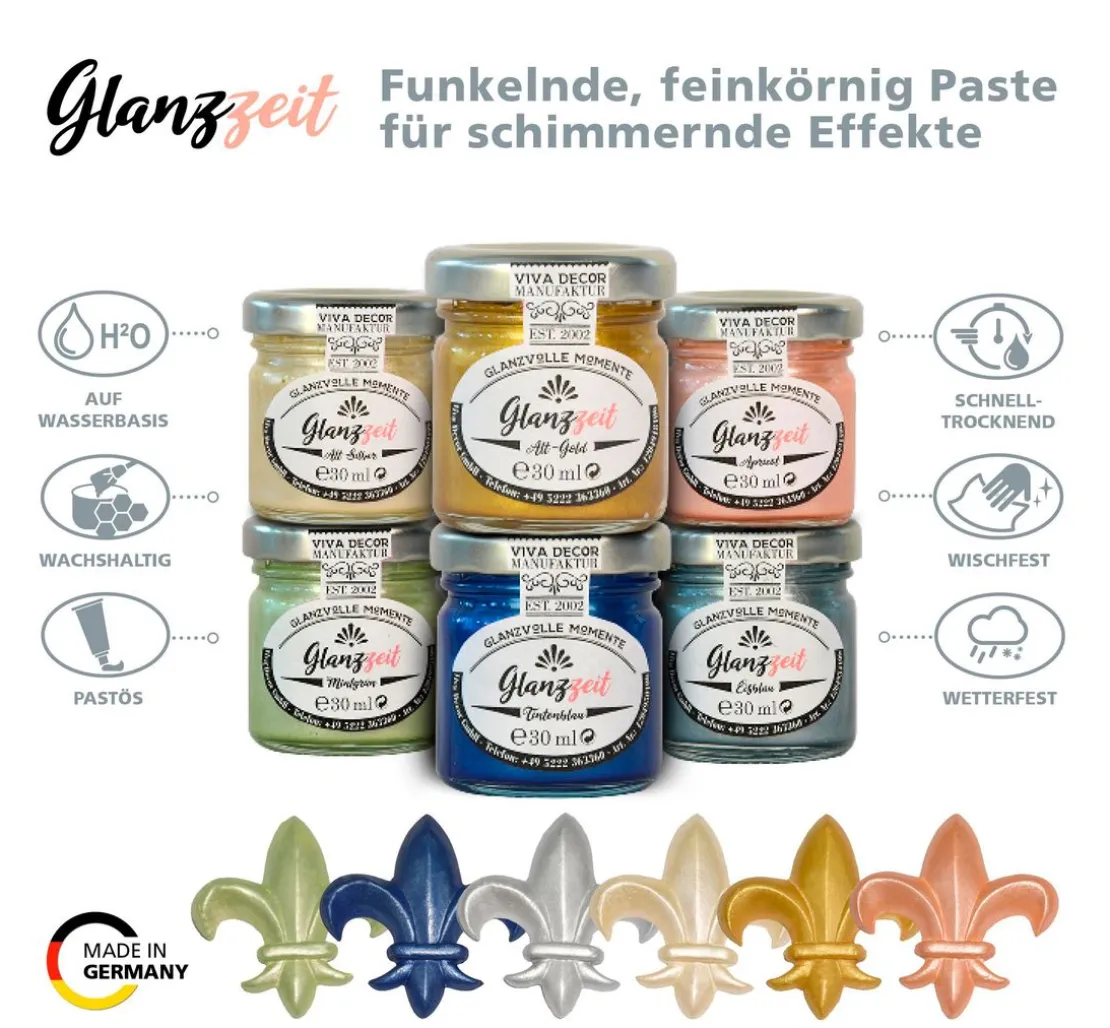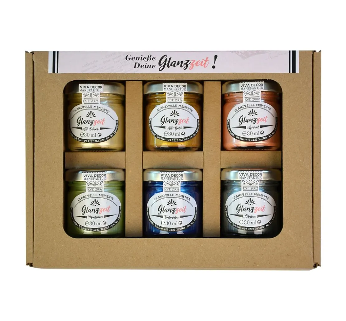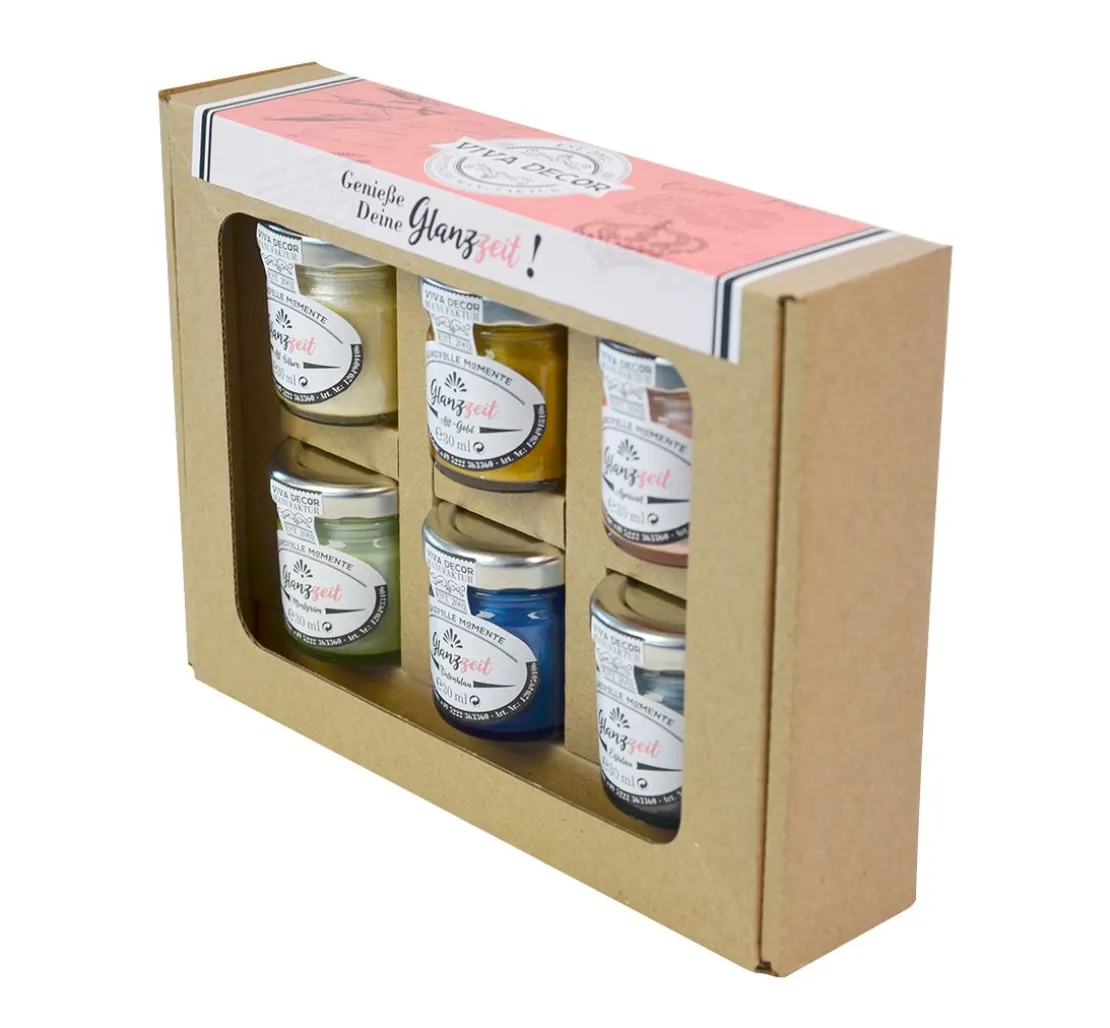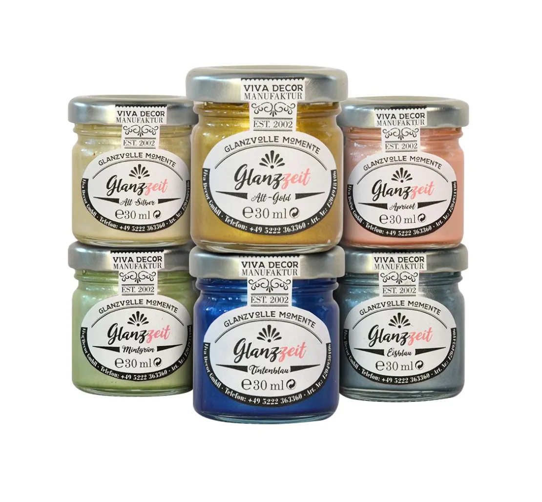 Das Viva Decor Glanzzeit „Glanzvolle Momente“ Set enthält sechs Metallglanzfarben in 30 ml Gläsern. Die auf Wasserbasis hergestellten Farben verleihen Dekorationsgegenständen aus Holz, Karton, Pappe, Ton, Beton und mehr einen schönen, effektvollen Glanz. Für saugende Untergründe geeignet. Die Gläser sind wiederverwendbar und die Verpackung ist aus 100 % recyceltem Papier hergestellt.