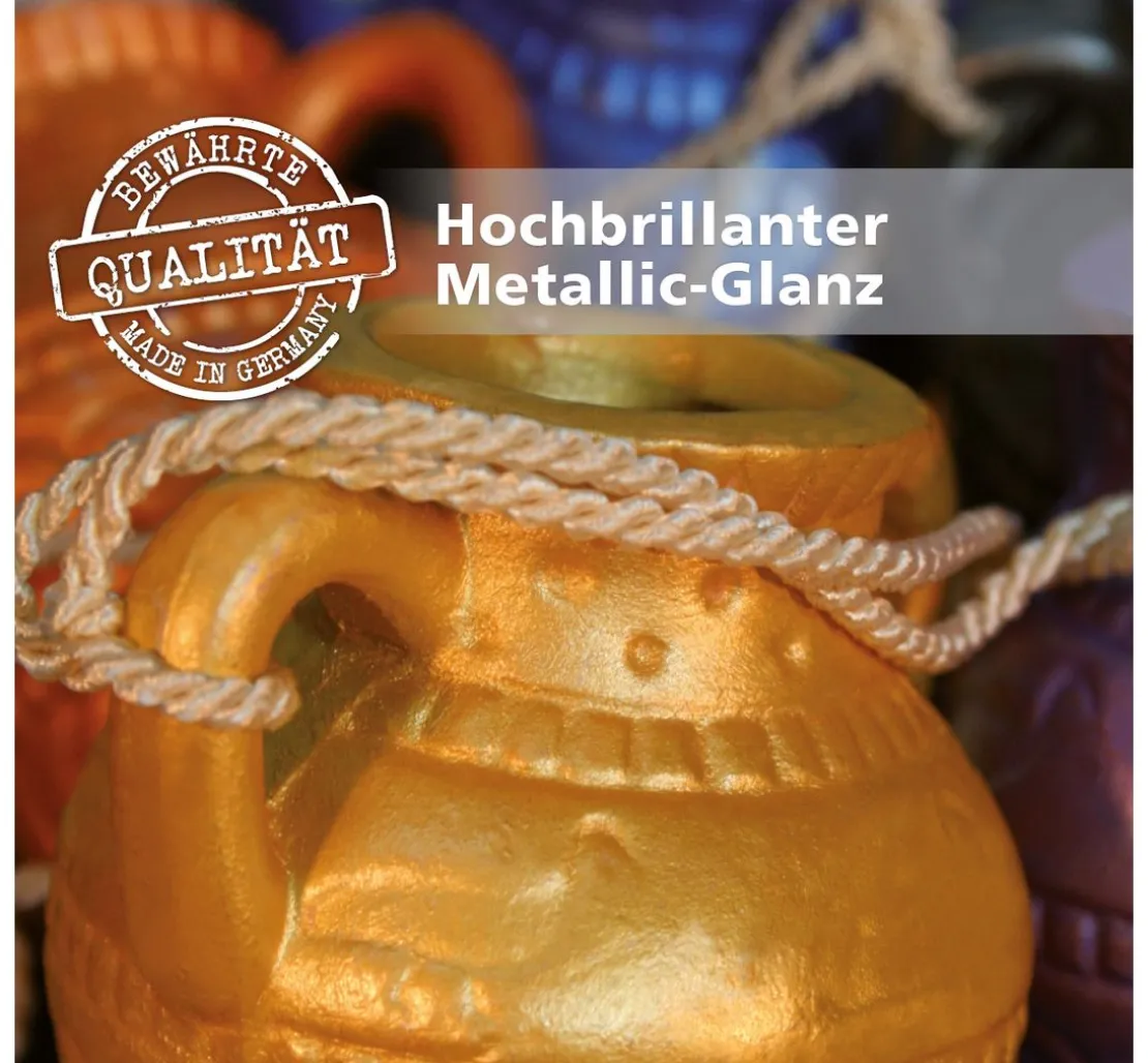 Die Metallglanzfarben können flächig verarbeitet oder auch mit der Schabloniertechnik aufgetragen werden. Besonders eindrucksvoll wirkt der Dekorationsgegenstand, wenn die Kanten patiniert werden. Hierbei werden diese mit einer zweiten Farbe leicht angetupft und schon entsteht ein 3D-Effekt.