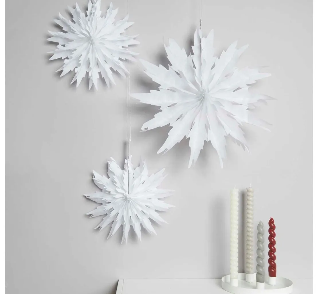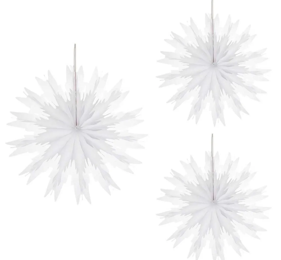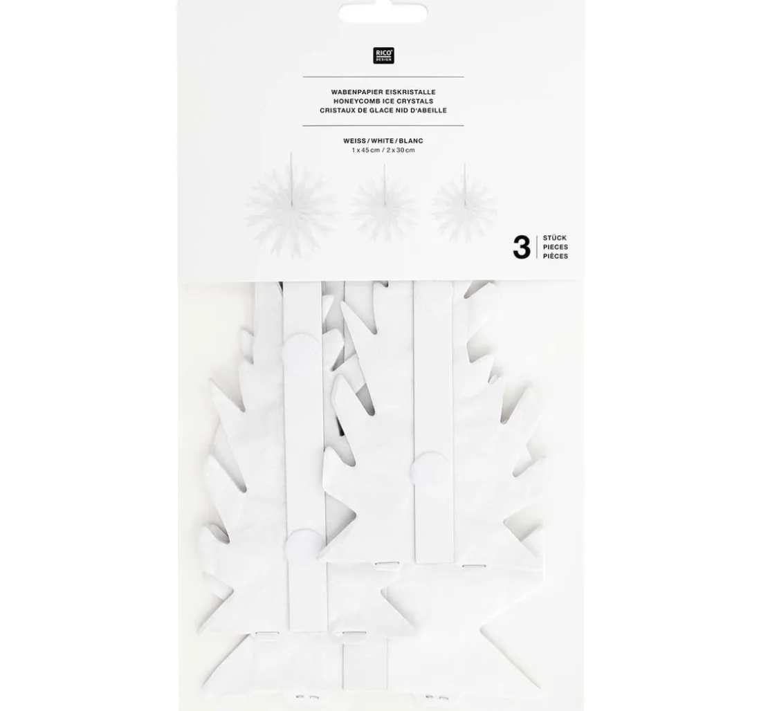 Du erhältst 3 Wabenpapier-Eiskristalle. 2 mit einem Ø von 30 cm und 1 mit einem Ø von 45 cm. Sie sind ein wunderschöner Blickfang und eignen sich perfekt als Dekoration für Weihnachts- und Winterfeiern. Auch als Geschenk sind sie eine tolle Idee.