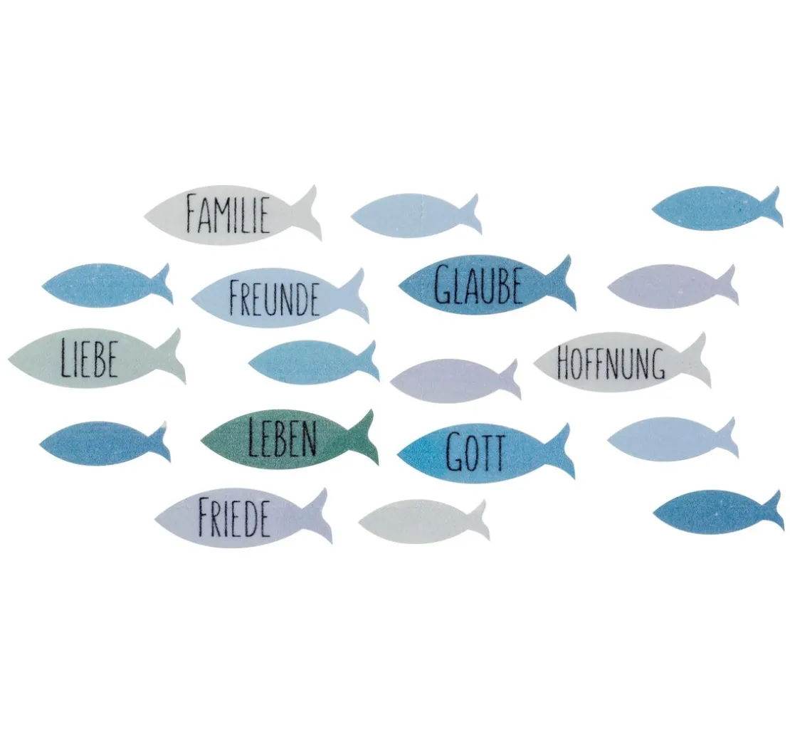 Dieses Wachsmotiv ist ca. 8,5 cm lang und 5 cm hoch. Einige Fische sind Wörtern wie Familie, Freunde, Glaube, Liebe, Hoffnung, Leben, Gott und Friede beschriftet.