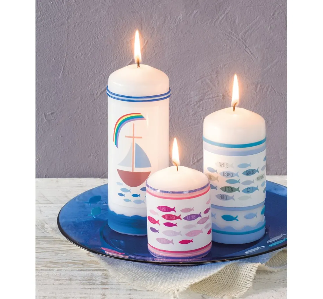 Ob zur Taufe, Konfirmation oder Kommunion mit diesem schicken Motiv wird jede Kerze zu einem liebevollen Blickfang. Zusätzlich kann beispielsweise noch der Name und das Datum mit einem Candle Liner auf die Kerzen aufgetragen werden, so wird die Kerze zu einem ganz persönlichen Unikat.