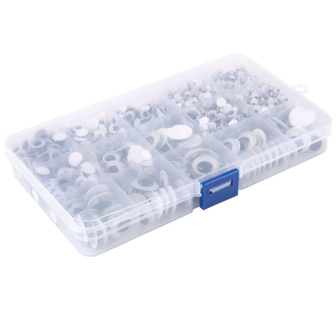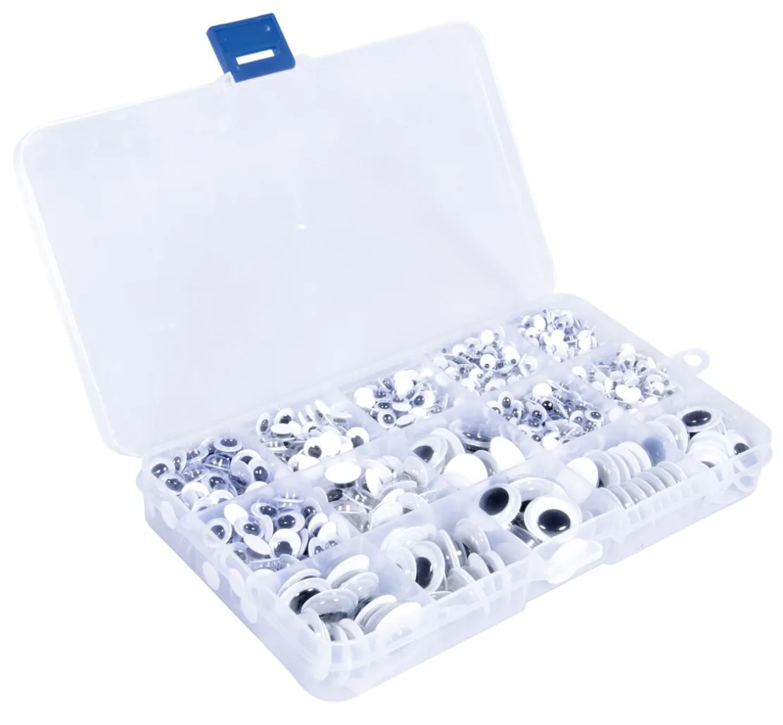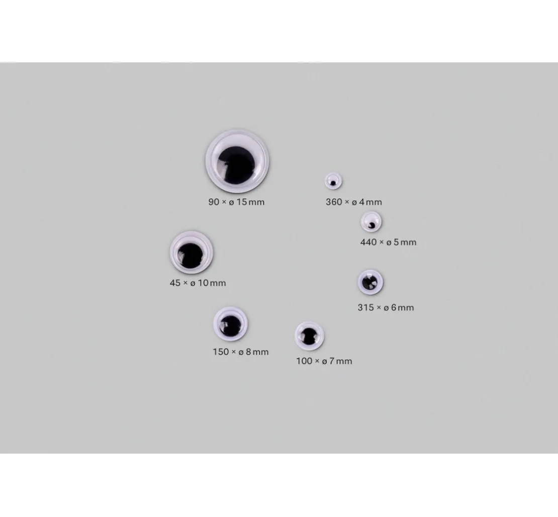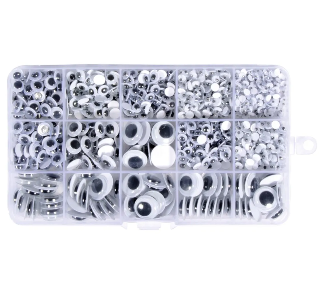 Die beweglichen Wackelaugen sind selbstklebend und verpackt in einer praktischen Kunststoff- Box. Enthalten sind 1500 Wackelaugen in den Größen Ø 4, 5, 6, 7, 8, 10 und 15 mm. Wackelaugen sind wunderbar zum Basteln und Gestalten und verleihen Ihrer Bastelarbeit Charme und Persönlichkeit.