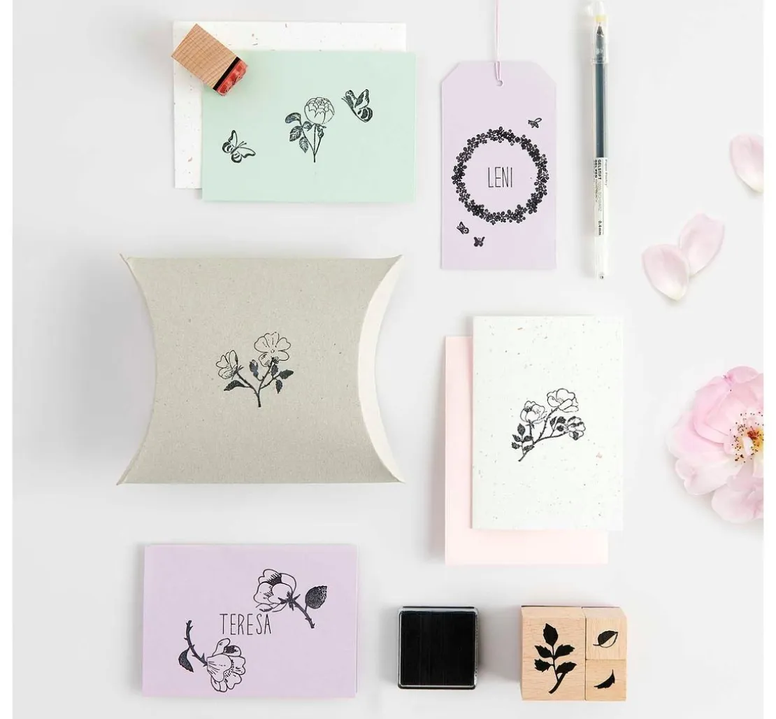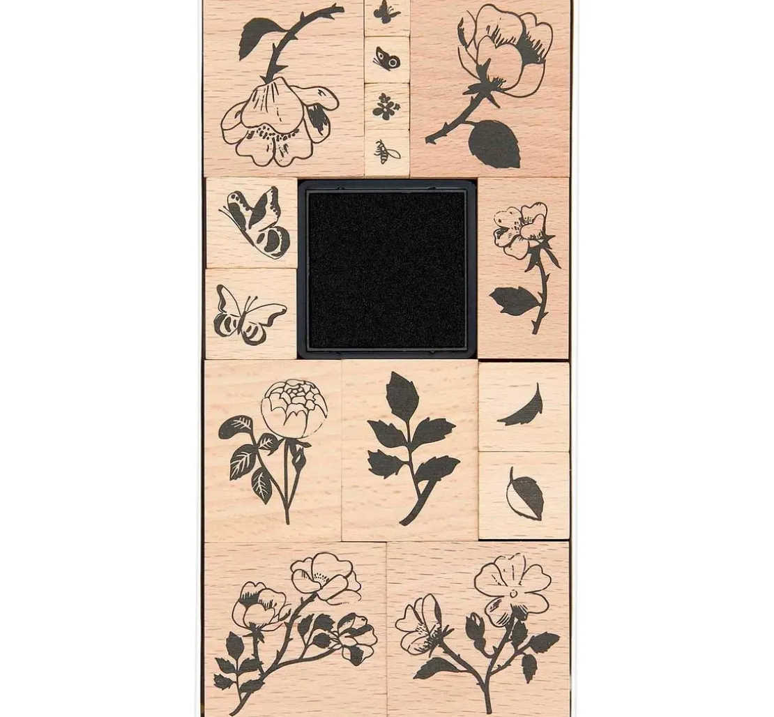 Dieses Set umfasst 15 exquisite Holzstempel aus Buchenholz mit kunstvollen Motiven wie Blumen und Schmetterlinge und ein schwarzes Stempelkissen.