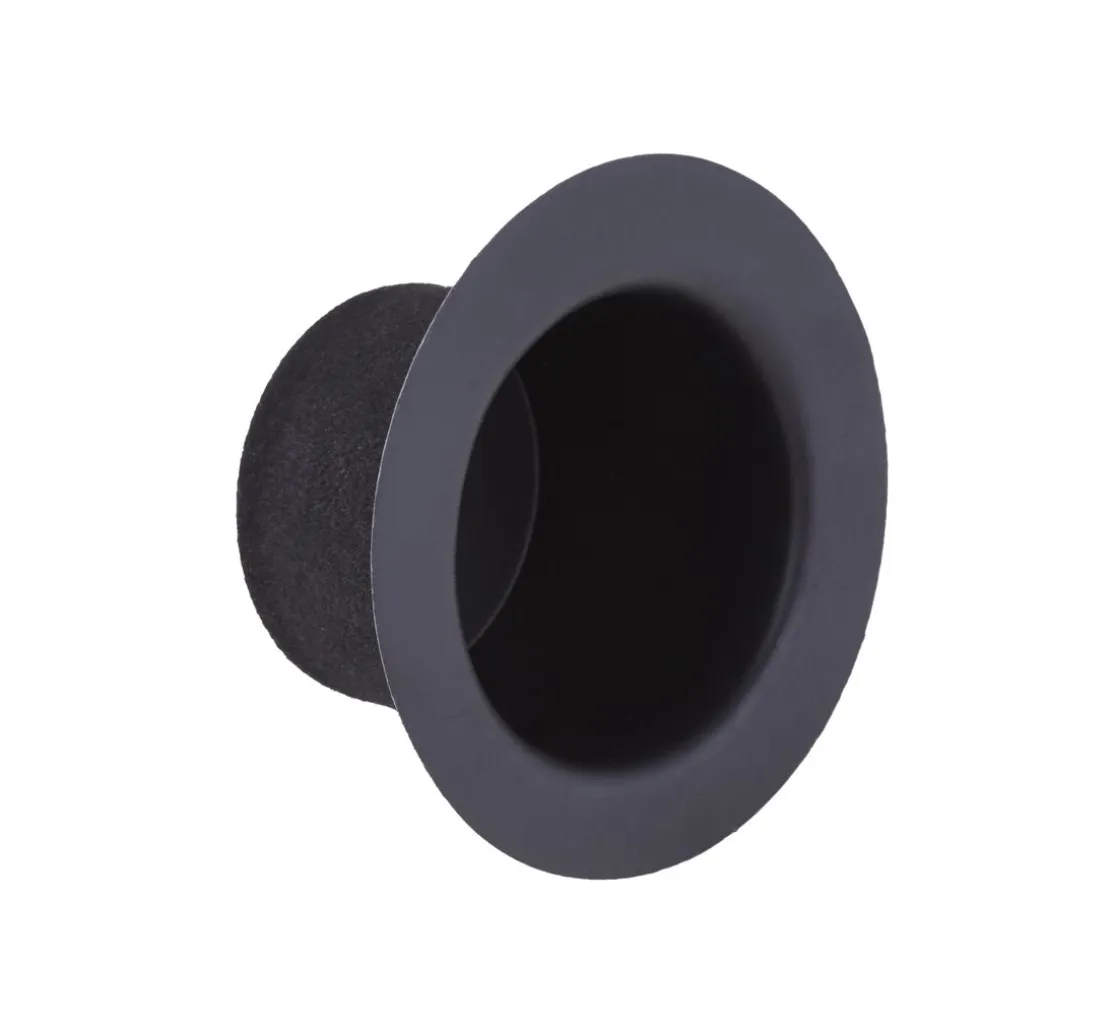 Der schwarze Zylinder besteht aus Kunststoff mit einem Überzug aus Velours. Die Größe ist ca. Höhe 3,4 cm, Außen-Ø ca. 6,5 cm und Innen-Ø ca. 4,2 cm.